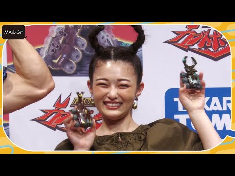 お笑い芸人のなかやまきんに君とタレントの井上咲楽さんが4月19日、東京都内で開催された「カブトボーグ新CM発表会」に登場した。