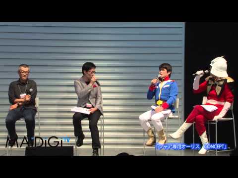 アニメ「機動戦士ガンダム」の人気キャラクター「シャア・アズナブル」をイメージしたコンセプトカー「シャア専用オーリス CONCEPT」が7日、東京・お台場で開催された「第5回MEGA WEBフェスタ in お台場学園祭」のイベント会場にお目見えし、"ガンダム芸人"の若井おさむさんとぬまっちさんが、大興奮でその魅力を語った。シャア・アズナブルの扮装(ふんそう)で登場したぬまっちさんは「パッと見てシャア専用と分かる。『ツノ』がないと思ったら、ちゃんとあるんですよね。いい意味でこんな"痛い車"初めて見ましたよ!」というと、主人公のアムロ・レイ姿の若井さんも「実は僕もシャアファンで、携帯もシャア専用」と夢中でアピールし、「(アムロ)本人は絶対言わないけど、『シャアザクにあこがれるなあ......』」とアムロの物まねを披露して、会場を盛り上げた。
