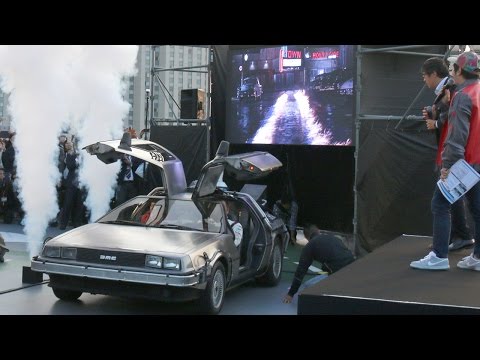 映画「バック・トゥ・ザ・フューチャーPart2」の劇中で描かれた“30年後の未来”にあたる10月21日、東京・お台場で劇中にタイムマシンとして登場する乗用車「デロリアン」が“到着”し、劇中での“未来”への到着時間である午後4時29分に走行する姿が披露された。会場には多数の報道陣や約750人のファンが詰めかけ、カウントダウンとともにデロリアンが走り出すと、大歓声が湧き起こった。