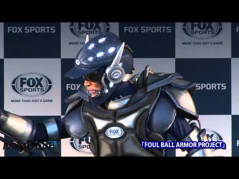 「FOX SPORTSジャパン」が3月27日、東京都内で「FOUL BALL ARMOUR PROJECT」の記者発表会を行い、お笑いコンビ「ますだおかだ」の岡田圭右さんとタレントの鈴木ちなみさんらが出席。岡田さんは「FOX SPORTS」のプロ野球中継で「画面から飛び出してくるファールボール」から視聴者を守るという設定の特殊アーマー「FOUL BALL ARMOUR」を着込んで登場した。(毎日新聞デジタル)