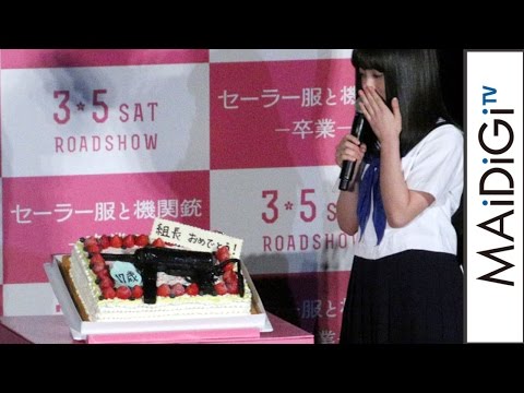 橋本さんは、機関銃がデザインされた特大ケーキに驚きながら「今まで生きていた中で最大、映画を作った仲間の皆さんと、こんなに多くの方に祝っていただいたのは初めて。本当に皆さんありがとうございます」と笑顔を見せた。17歳については「この映画を機に、もっともっと芯のあるいろんな役になり代われる女優さんになりたい。主題歌も歌わせていただいてますので、演技の方も歌の方ももっともっと頑張っていきたいと思います」と抱負を語った。