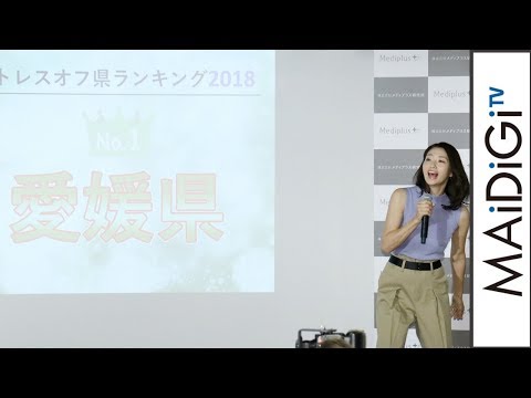 タレントの眞鍋かをりさんが4月17日、東京都内で行われた「ストレスオフ県ランキング2018」の記者発表会に、タレントの鈴木奈々さんとともに出席。「ストレスオフ県ランキング」は、化粧品販売のメディプラスと関連会社のメディプラス研究所が、全国の20~69歳の女性約7万人を対象に実施したインターネット調査から、ストレスオフ度を推定して発表している。今回で3回目。ストレスオフ指数が高い順にランキングしており、第1回の1位は鳥取県、第2回は愛媛県だった。今回の1位は昨年に引き続き、愛媛県となった。
