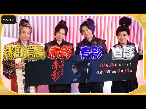 佐藤さんが赤影、木村さんが青影、加藤さんが白影、TAKAHIROさんが織田信長を演じる。