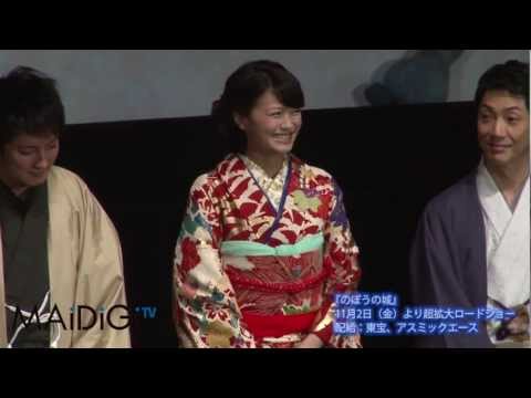 狂言師の野村萬斎さんの主演映画「のぼうの城」(11月2日公開、犬童一心・樋口真嗣監督)の舞台あいさつが10月23日、「第25回東京国際映画祭」の一環として東京都内で行われ、野村さんや榮倉奈々さん、上地雄輔さんらキャストが登場。この日、イベントでは初披露という和装姿で登場した榮倉さんは、撮影中に驚いたこととして、「北海道に立てたオープンセットが、東京ドームの20個分の土地を使って、アミューズメントパークみたいだった」と紹介。すかさず隣にいた上地さんが悔しそうな表情を見せると、榮倉さんは「あ、言おうと思ってましたね? お先に!」とニヤリと笑い、会場の笑いを誘った。