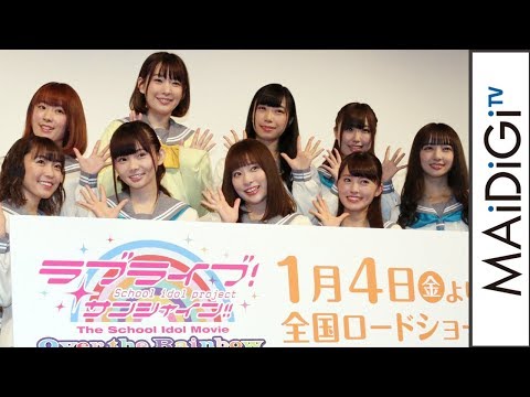 人気アニメ「ラブライブ!サンシャイン!!」の新作劇場版アニメ「ラブライブ!サンシャイン!!The School Idol Movie Over the Rainbow」(酒井和男監督、2019年1月4日公開)の完成披露試写会が12月28日、スペースFS汐留(東京都港区)で開催された。アニメに登場するスクールアイドルグループ「Aqours(アクア)」のキャスト9人はこの日、初めて劇場版を見たといい、津島善子役の小林愛香さんは「感動して抜け殻みたいになりました」と目を潤ませながら語り、黒澤ルビィ役の降幡愛さんは「泣いてしまいまして……。涙なしでは見られない作品」と感動した様子だった。
