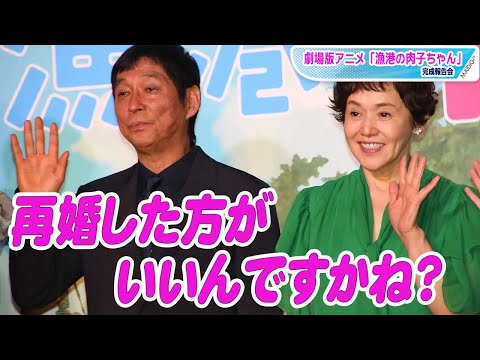お笑いタレントの明石家さんまさんが5月26日、東京都内で行われた劇場版アニメ「漁港の肉子ちゃん」(渡辺歩監督、6月11日公開)の完成報告会に、主人公・肉子ちゃんの声を務める女優の大竹しのぶさんらと登場した。同作を企画・プロデュースしたさんまさんは、冒頭にあいさつを求められると「久々にこういう記者会見の席で。隣に大竹さんがいらっしゃる……再婚した方がいいんですかね?」とギャグを飛ばして笑いを誘う一幕も。その後も、元妻の大竹さんと息の合った掛け合いを見せて場を和ませていた。