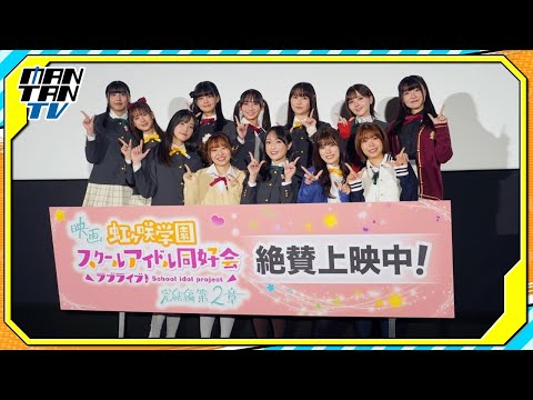 舞台あいさつには、高咲侑役の矢野妃菜喜さん、上原歩夢役の大西亜玖璃さん、中須かすみ役の相良茉優さん、桜坂しずく役の前田佳織里さん、朝香果林役の久保田未夢さん、宮下愛役の村上奈津実さん、近江彼方役の鬼頭明里さん、エマ・ヴェルデ役の指出毬亜さん、天王寺璃奈役の田中ちえ美さん、三船栞子役の小泉萌香さん、ミア・テイラー役の内田秀さん、鐘嵐珠役の法元明菜さんが集結した。