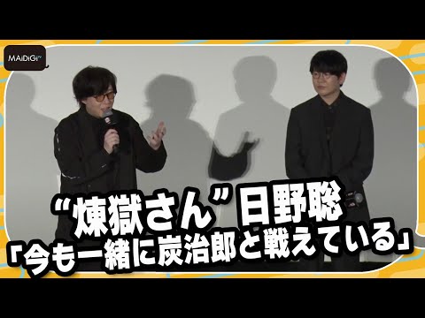 吾峠呼世晴(ごとうげ・こよはる)さんの人気マンガが原作のアニメ「鬼滅の刃」の劇場版アニメ「劇場版『鬼滅の刃』無限列車編」リバイバル上映の公開記念舞台あいさつが5月10日、TOHOシネマズ日比谷(東京都千代田区)で行われ、竈門炭治郎役の花江夏樹さん、煉獄杏寿郎役の日野聡さんが登壇した。「無限列車編」の後、煉獄の日輪刀の鍔(つば)は炭治郎に託されることになったが、日野さんは「今も一緒に炭治郎と戦えているという思いがあります」と語った。