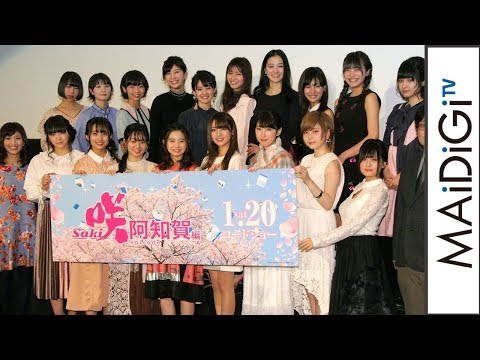 舞台あいさつには、主人公チーム「阿知賀女子学院」の高鴨穏乃(たかかも・しずの)を演じる桜田ひよりさんのほか「フェアリーズ」の伊藤萌々香さん、「SUPER☆GiRLS」の渡邉幸愛さん、「私立恵比寿中学」の中山莉子さんの阿知賀メンバー、小倉優香さん、「アップアップガールズ(仮)」の新井愛瞳さん、RaMu(ラム)さん、元AKB48の岩田華怜さんらライバル校のメンバー、小沼監督の計20人が出席した。阿知賀メンバーの松実玄(まつみ・くろ)を演じた女優の恒松祐里さんはインフルエンザのため欠席した。