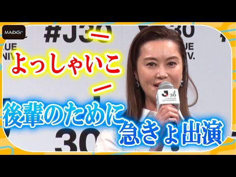 女優の観月ありささんが1月25日、東京都内で行われたサッカー「Jリーグ30周年オープニングイベント」に登場した。この日は、タレントの朝日奈央さんが登場予定だったが、体調不良のため、同事務所の観月さんが急きょ出席した。