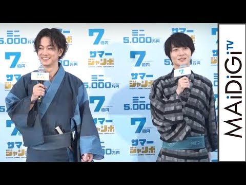 俳優の佐藤健さんと神木隆之介さんが7月2日、東京都内で行われた「サマージャンボ宝くじ」発売記念イベントに登場した。