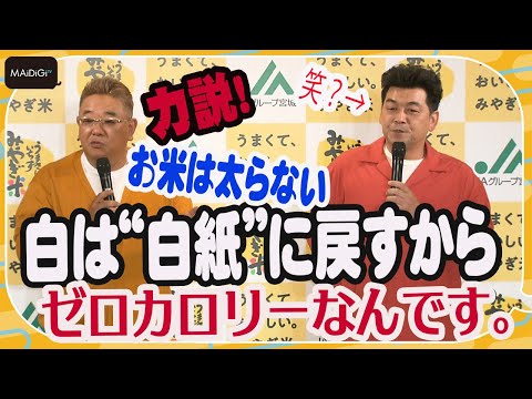 お笑いコンビ「サンドウィッチマン」の伊達みきおさんと富澤たけしさんがこのほど、東京都内で行われた「令和4年産宮城米説明会および新CM発表会」に登場した。発表会では、2人が出演するCMも披露された。