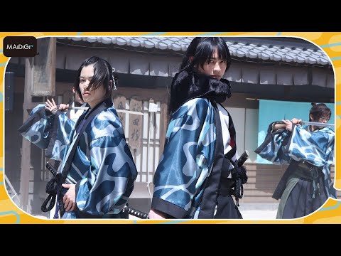 テレビ朝日の「シン・時代劇ドラマ」として4月24日深夜にスタートする「君とゆきて咲く~新選組青春録~」(水曜深夜0時15分~同45分、一部地域を除く)でダブル主演を務める前田拳太郎さん、奥智哉さんらメインキャスト9人が19日、東映太秦映画村(京都市右京区)で開かれた会見に出席。招待されたファンらを前に、劇中で見せる華麗な「剣舞」を披露した。