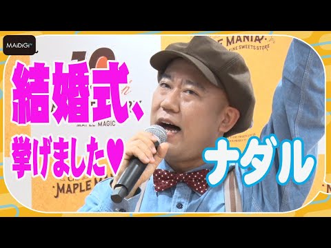 お笑いコンビ「コロコロチキチキペッパーズ(コロチキ)」のナダルさんが9月12日、東京都内で行われた「ザ・メープルマニア 10周年記念出発式」に、相方の西野創人さんとともに登場。4年前に結婚した妻と6日に結婚式を挙げたことをSNSで投稿したナダルさんは「結婚式挙げました!」と笑顔でエピソードを語った。