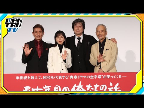 中村雅俊さん主演の青春ドラマで、放送開始から50周年を迎えた「俺たちの旅」を映画化した「五十年目の俺たちの旅」(2026年1月9日公開)の完成披露上映会が12月8日、東京都内で行われ、中村さん、秋野太作さん、田中健さん、岡田奈々さんが登場した。
