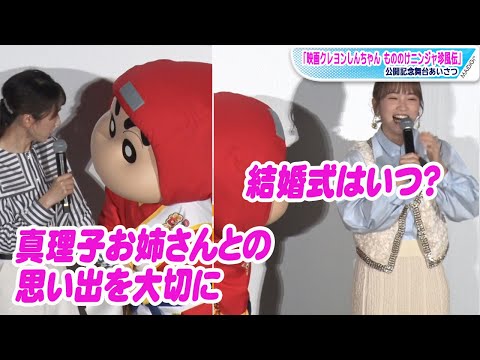 人気アニメ「クレヨンしんちゃん」の第30作となる劇場版最新作「映画クレヨンしんちゃん もののけニンジャ珍風伝(ちんぷうでん)」(橋本昌和監督)の公開記念舞台あいさつが4月23日、東京都内で行われ、ゲスト声優を務めた川栄李奈さん、お笑いコンビ「ハライチ」が登場した。MCはテレビ朝日の堂真理子アナウンサーが務めた。