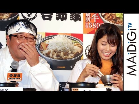稲村さんと竹山さんは11月から販売される北海道や博多など五つの地域の「ご当地鍋」を試食し、稲村さんは「(なごや鶏みそ鍋膳は)燃えるような感情が出てきて。まさに燃えよ“ドラゴンズ”です」「(博多とんこつ鍋膳は)高菜と黒マー油、ぜんぶうまくかみあってて。層の分厚い“ソフトバンクホークス”のようなお鍋です」などと得意の野球にからめて感想を披露。週に2回は通うほどの吉野家ファンという竹山さんも、各地域の方言を駆使して“食リポ”し、場を盛り上げた。