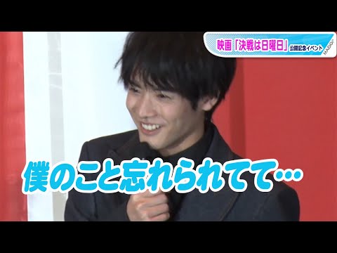 俳優の赤楚衛二さんが1月8日、東京都内で行われた窪田正孝さんの主演映画「決戦は日曜日」(坂下雄一郎監督)の公開記念イベントに窪田さん、宮沢りえさん、坂下監督とともに登場した。