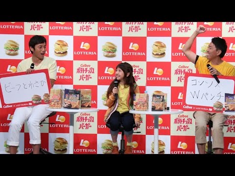 この日はロッテリアと、カルビーの発売40周年を迎えるロングセラー商品「ポテトチップス」のコラボメニューの発表会で、人気子役の谷花音ちゃんも登場。2種類の新バーガー「絶品チーズポテトチップスバーガー(絶品チーズバーガーソース)」(420円)と「サラダチキンポテトチップスバーガー(コンソメWパンチソース)」(390円)を試食して味をレポートしたり、4種類のポテトチップス味の「ふるポテ」(300円)から、チュートリアルの2人が花音ちゃんの好みの味を当てたりして、どちらが花音ちゃんの理想の父親かを競った。新メニューは24日から発売。
