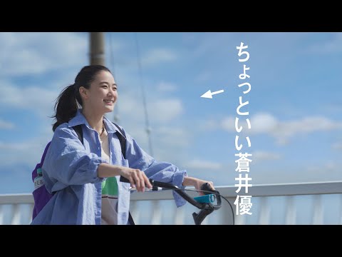 新CMは15秒。澄み切った青空の下、公私ともに充実している“最近ちょっといい蒼井さん”が、爽やかなシャツとクロップドパンツ、リュックを背負ったラフな装いで海沿いの道を自転車で走り、お茶を飲んで“ちょっといい水分補給”をする姿や、海辺で行われている太極拳教室に参加する様子が映し出されている。