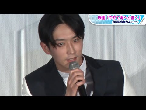 俳優の杉野遥亮さんが4月2日、東京都内で行われた映画「やがて海へと届く」(中川龍太郎監督)の公開記念舞台あいさつに、主演の岸井ゆきのさんらと登場した。