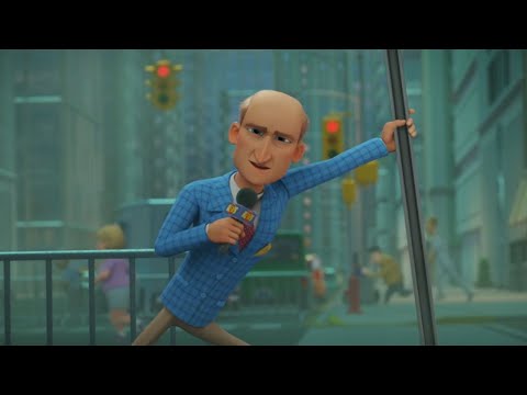 ライバール市長が悪だくみに使用した天候調整マシーンが壊れてしまい、雲一つない青空とそよ風に包まれていたアドベンチャーシティは、たちまち真っ黒に染まった雲が立ち込め、大嵐に。今回の映像には、そんな街の様子を必死に伝えるマーティが映し出される。そして突風が吹いた瞬間、トレードマークのリーゼントが吹っ飛んでしまう……という場面が収められている。
