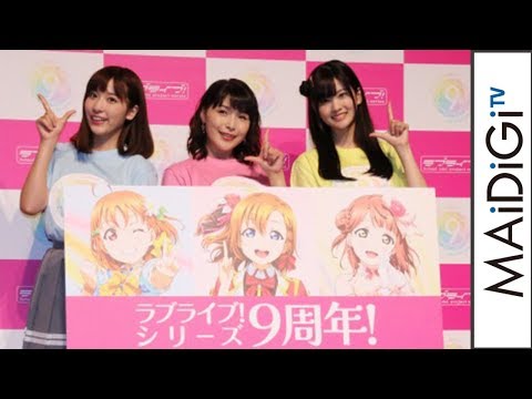 「『ラブライブ!』シリーズ9周年発表会」が東京都内で開催され、「ラブライブ!」の高坂穂乃果役の新田恵海さん、「ラブライブ!サンシャイン!!」の高海千歌役の伊波杏樹さん、「虹ヶ咲学園スクールアイドル同好会」の上原歩夢役の大西亜玖璃さんが登場した。