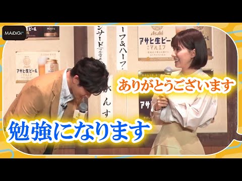 女優の芳根京子さん、俳優の松下洸平さんが2月13日、東京都内で行われた「アサヒ生ビール」の新CM発表会に登場した。
