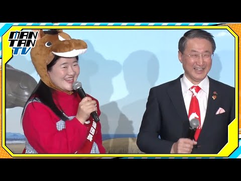 お笑いコンビ「ガンバレルーヤ」のよしこさんとまひるさんが1月21日、東京都内で行われた鳥取県をPRするイベント「馬取県(まっとりけん)」就名発表会に同県の平井伸治知事とともに登場した