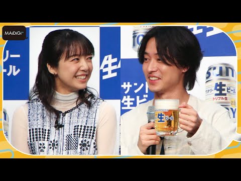 上白石さんは、1回目は最後に泡を多く足して失敗したものの、2回目のチャレンジで成功。上白石さんが「“サン生”ひとつどうぞ!」とビールを山崎さんの目の前に置くと、山崎さんは「うわ、完全な黄金比」と感嘆。一口飲んだ山崎さんが「めちゃめちゃおいしかったです」と絶賛すると、上白石さんは「ありがとうございます」と喜びつつ、「変な汗が止まらないです」と照れ笑いを浮かべていた。