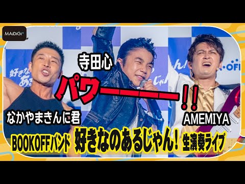俳優の寺田心さんが8月3日、東京都内で行われた「BOOKOFFバンド 好きなのあるじゃん!生演奏ライブ」に、リーゼント姿で登場。なかやまきんに君のパーカッションと、AMEMIYAさんのギターに合わせてブックオフのCM楽曲「好きなのあるじゃん!」を披露した。
