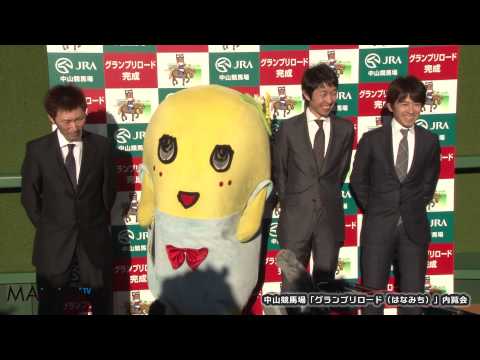 千葉県船橋市の非公認キャラクター「ふなっしー」が12月2日、中山競馬場(千葉県船橋市)で開かれた「グランプリロード(はなみち)」の設置記念イベントに登場。武豊騎手や蛯名正義騎手、福永祐一騎手と共に、馬車に乗って新名所をアピールした。