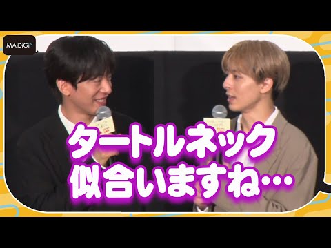俳優の高杉真宙さん主演、ヒロイン役で女優の関水渚さんも出演する映画「いつか、いつも‥‥‥いつまでも。」(長崎俊一監督)の公開記念舞台あいさつが10月15日、東京都内で行われ、高杉さんや関水さん、「Creepy Nuts」のDJ松永さんらが登場した。