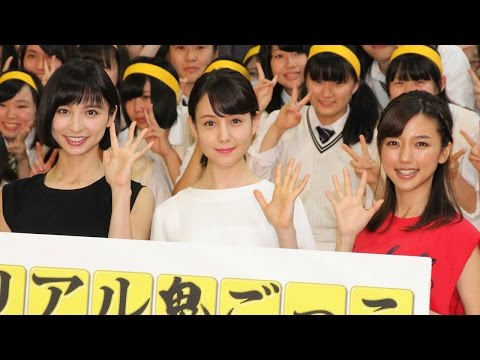 女優のトリンドル玲奈さん、真野恵里菜さん、篠田麻里子さんが7月7日、東京都内の女子高校で行われた映画「リアル鬼ごっこ」(園子温監督)の公開記念イベントに登場し、現役女子高生100人とともに劇中さながらに本気の鬼ごっこに挑戦。全力疾走で鬼から逃げ回った。