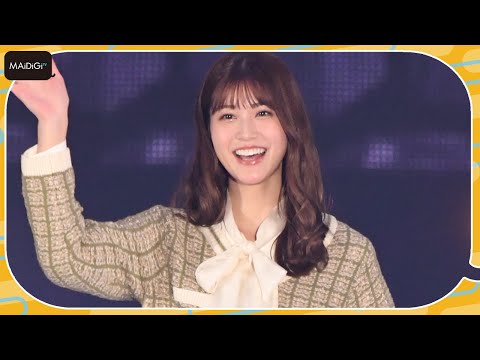 生見さんはファッションブランド「F i.n.t(フィント)」のステージに登場。チェックのニットカーディガン&ミニスカートに大きめのリボンが印象的なブラウスを合わせたレトロでガーリーなコーディネートだった。