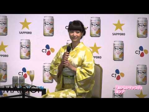 サッポロビールのフルーツマッコリ「CJおいしいマッコリ<ピンクグレープフルーツ>」の発表会見が行われ、同商品のCMに出演しているモデルのヨンアさんが登場しました。