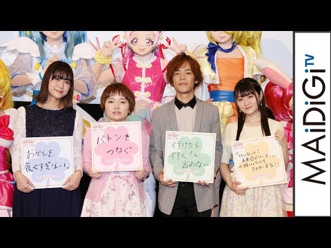 人気アニメ「プリキュア」(ABC・テレビ朝日系)シリーズの劇場版「映画プリキュアスーパースターズ!」(池田洋子監督)の初日舞台あいさつが3月17日、新宿バルト9(東京都新宿区)で行われ、声優の引坂理絵さん、本泉莉奈さん、小倉唯さん、小野賢章さんが登場した。2月にスタートした「HUGっと!プリキュア」で野乃はな(キュアエール)を演じる引坂さんは、劇場版のテーマが「約束」であることから「守りたい約束」を発表することになり、「バトンをつなぐ。『プリキュア』には、今まで先輩がつないできた歴史があり、私たちがいる。今度は私たちが次につなげていきたい」と力強く宣言した。