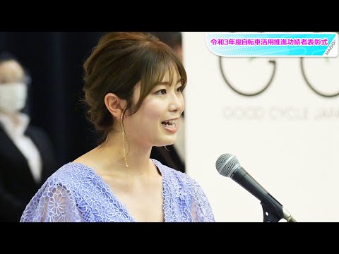 タレントで、自転車アンバサダーの稲村亜美さんが5月31日、オンラインで開催されたオンラインで開催された国土交通省の自転車活用推進本部による「令和3年度自転車活用推進功績者表彰式」に出席。美しいデコルテを見せたVネックで、透け感のある総レースのドレス姿だった。
