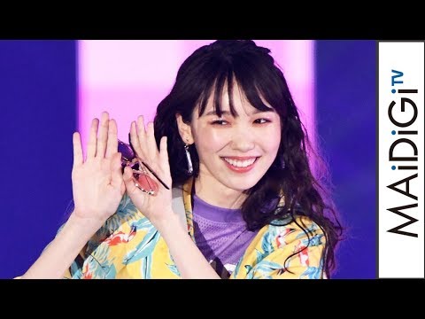 飯豊さんは、黄色地のアロハシャツに、スポーツウエア風のパープルTシャツ、白いパンツ、足元はスポーティーな厚底サンダルというレトロ、かつポップでスポーティーなファッション。音楽に合わせて飛び跳ねるなどして、笑顔をハジけさせていた。