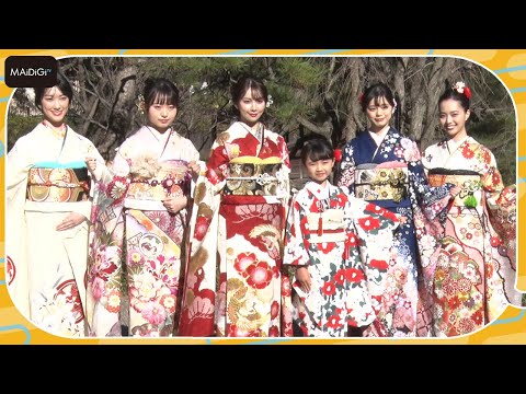 撮影会は、「一蔵」「京都丸紅」の衣装協力で開催。紺野さんらのほか、其原有沙さん、新関碧さん、桜井凜さんも、あでやかな晴れ着姿で参加した。