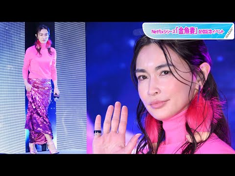 女優の長谷川京子さんがこのほど、東京都内で行われた、配信中のNetflixオリジナルシリーズ「金魚妻」(並木道子監督、楢木野礼監督、松山博昭監督)の配信記念イベントに登場した。スパンコールたっぷりのスカート、タートルネックのショート丈トップス、羽根のようなイヤリング、オープントゥのストラップパンプスをピンクでそろえたおしゃれ上級者の装い。スカートはマーメイドラインで大人のムードだった。鮮やかなブルーのネイルが差し色になっていた。