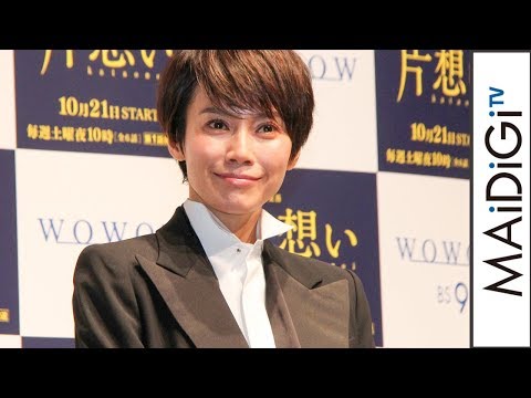 女優の中谷美紀さんが10月1日、東京都内で開かれたWOWOWの連続ドラマ「連続ドラマW 東野圭吾 『片想い』」の舞台あいさつに黒のパンツスーツ姿で登場した。体は女だが心は男という性同一性障害の難役に挑んだ中谷さんは「男性らしさを追求した。桐谷(健太)さんに負けないよう筋トレをして、ヒレステーキや卵を食べて、プロテインを増やしたのですが、なかなか難しい。男になりきれないと感じた」と明かした。