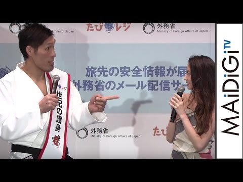 タレントの河北麻友子さんと柔道家の篠原信一さんが3月27日、成⽥空港で行われた外務省の海外安全情報メール配信サービス「たびレジ」の登録促進イベントに登場した。