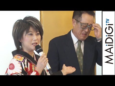 お笑いタレントの友近さん扮(ふん)する自称大物演歌歌手、水谷千重子さんが8月23日、東京都内で行われた明治座2019年2月公演「水谷千重子50周年記念公演」の製作発表会見に登場した。