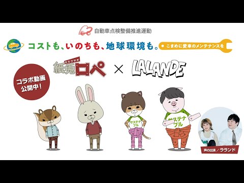 ムービーでは、「コストも、いのちも、地球環境も。~こまめにメンテナンスを~」をキャッチコピーに、「紙兎ロペ」のキャラクターが点検整備の重要性について熱弁。最後には“サステナブル”とプリントされたTシャツを着たラランドの2人が登場する。