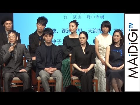 NODA・MAP第22回公演「贋作 桜の森の満開の下」の製作発表会見が4月5日、東京都内で行われ、妻夫木聡さんや深津絵里さん、天海祐希さん、古田新太さん、秋山菜津子さん、大倉孝二さん、藤井隆さん、村岡希美さん、門脇麦さん、池田成志さん、銀粉蝶さん、演出を務める野田秀樹さんが出席した。