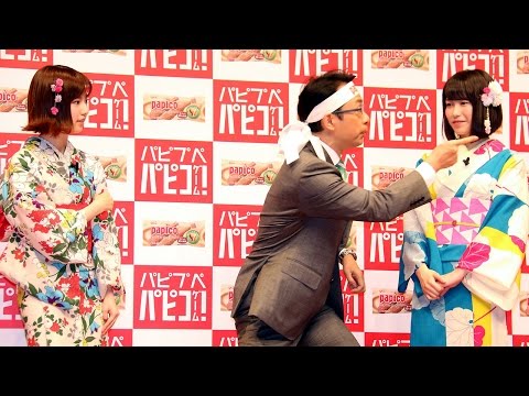 AKB48メンバーがイメージキャラクターを務め、島崎さん、横山さんに加え、柏木由紀さんや渡辺麻友さんも浴衣姿で登場する「パピコ」新CMは7月1日から放送。発表会にはCMに出演している小嶋真子さん、高橋朱里さん、田野優花さん、向井地美音さん、山田菜々美さんも登場した。