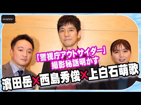 コミカル? シリアス? 俳優の西島秀俊さん主演の連続ドラマ「警視庁アウトサイダー」(テレビ朝日系、木曜午後9時)が話題だ。“誰も見たことのない超異色刑事ドラマ”をうたっているが、主人公・架川英児(西島さん)の携帯の着信音が「はぐれ刑事」だったり、缶コーヒーの名前が「しげるのブラックコーヒー」だったりとコミカルなネタやギャグが挟まりつつ、英児と“バディー”の蓮見光輔(濱田岳さん)が互いを利用し合うなどシリアスな展開もある。主演の西島さん、脇を固める濱田さんと上白石萌歌さんに今作について話を聞くと、3人の楽しげな雰囲気から、このドラマの方向性が見えてきた。
