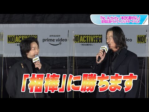 俳優の豊川悦司さんが12月17日、明治神宮外苑軟式球場(東京都新宿区)で、Amazon Prime Video(プライムビデオ)の配信ドラマ「No Activity/本日も異状なし」のドライブインシアターイベントに、共演の中村倫也さん、木村佳乃さん、岸谷五朗さん、お笑いコンビ「シソンヌ」のじろうさんらと登場した。