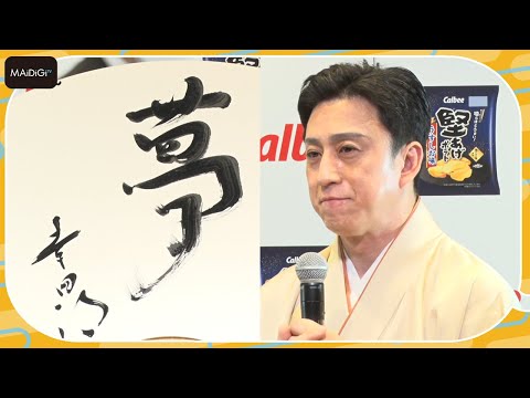 発表会では、堅あげポテト応援部長に就任した幸四郎さんが、プレゼントされたオリジナル扇子を使ってオリジナルの堅あげポテト応援の舞「三番叟」(さんばそう)を生披露。扇子型特製パネルには、自身の今年の一文字を筆で書き込んだ。